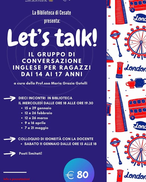 A grande richiesta riproponiamo il Gruppo di Conversazione in lingua Inglese per ragazzi dai 14 ai 17 anni a cura della Prof.ssa Maria Grazia Gotelli.