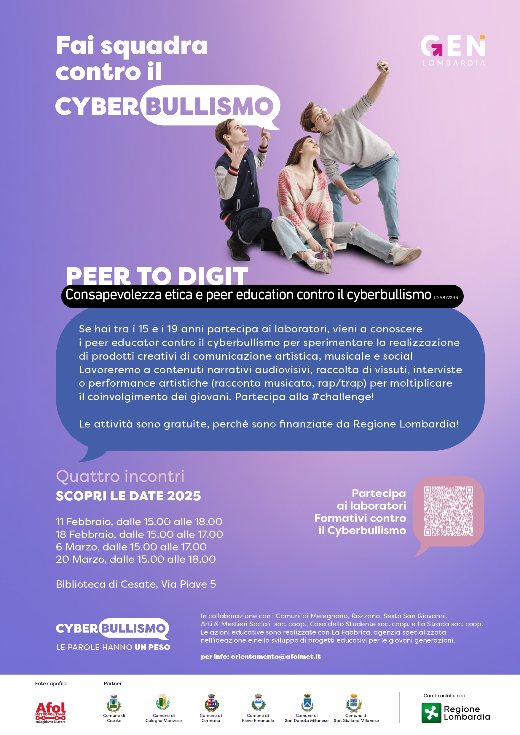 Il Comune di Cesate è partner di questo progetto, finanziato da Regione Lombardia e realizzato in collaborazione con AFOL Metropolitana, con l’obiettivo di coinvolgere i giovani nel contrasto dei fenomeni di bullismo e cyberbullismo, attraverso un lavoro di condivisione tra ragazzi della stessa età.