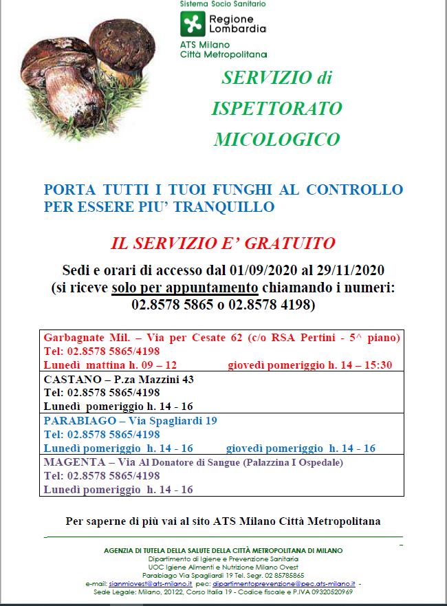 Come ogni anno viene attivato dal 01.09.2020 al  29.11.2020  il servizio gratuito di Ispettorato Micologico presso le sedi territoriali di ATS Milano Ovest  e,considerata la situazione di emergenza sanitaria da Covid-19  in essere, le analisi sui funghi saranno effettuate esclusivamente previo appuntamento telefonico.