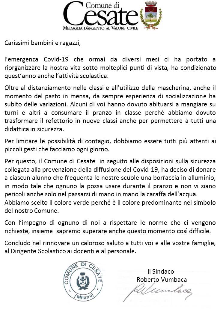 Il Sindaco oggi ha consegnato al Dirigente Scolastico Prof. Graziano Palma circa 700 borracce in alluminio da distribuire a tutti gli alunni delle scuole primarie di Cesate.